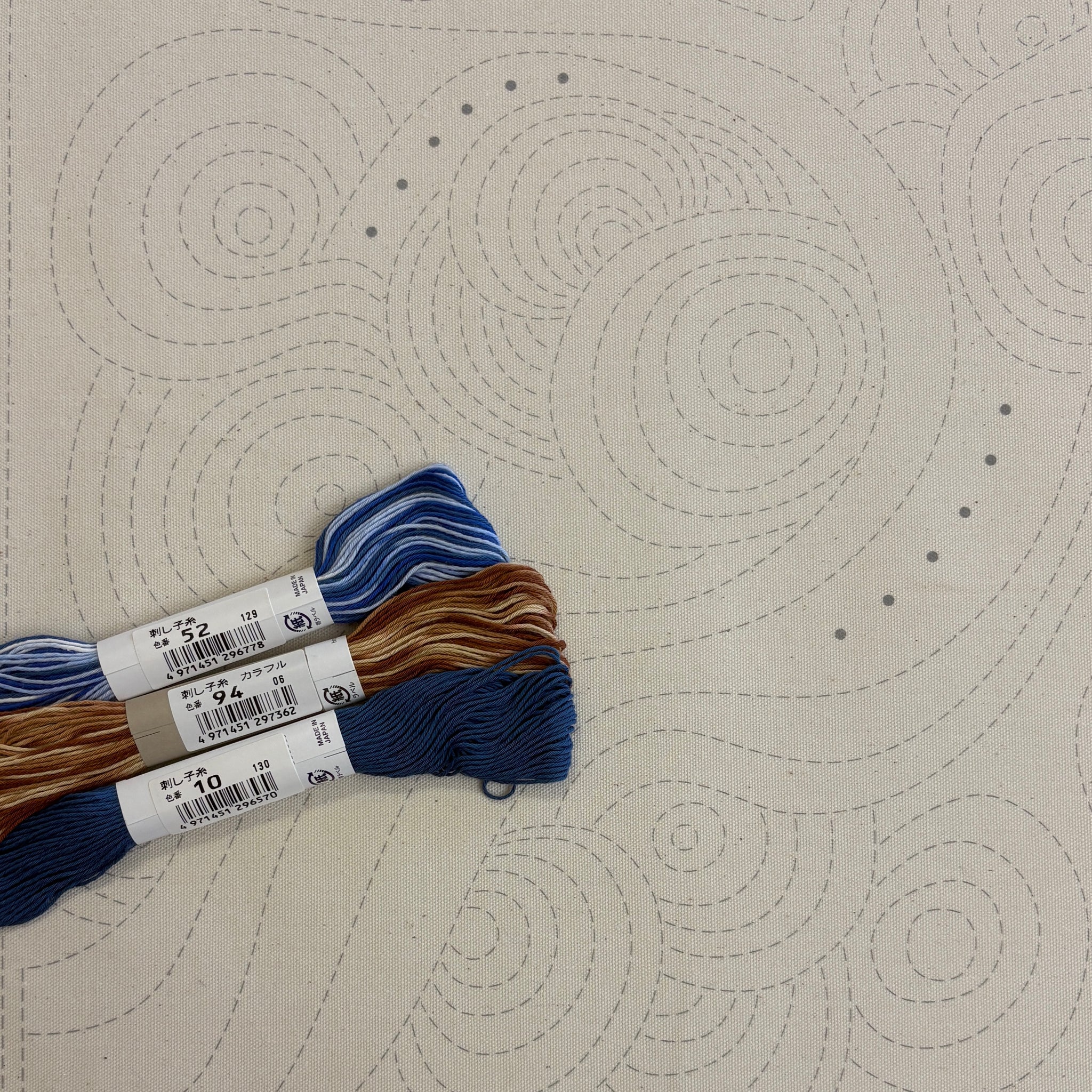 Choose a single colour thread for subtle texture, or a variety of sand and blues for a more traditional look. We recommend 3 x 20 metre skeins of thread - 1 x solid colour, 1 x variegated thread and the remaining thread can be either solid or variegated.